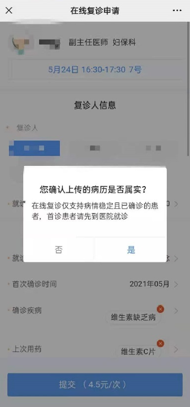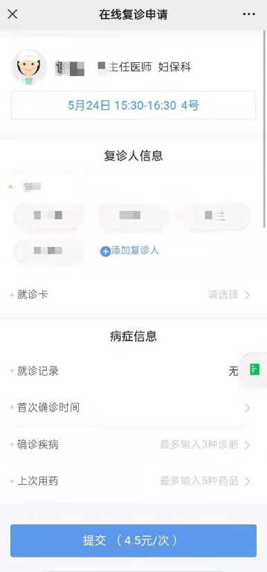③ 进入复诊申请界面,请认真阅读患者须知,选择复诊人,如实填写病症信息,详细描述病情,确认后点击提交