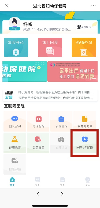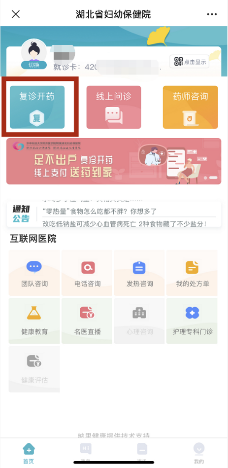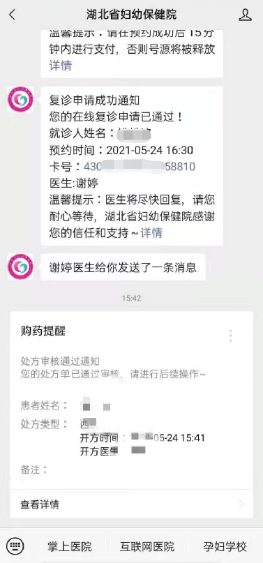 您只需通过“湖北省妇幼保健院”微信公众号进入“互联网医院”,选择复诊开药,即可享受足不出户,送药到家的便捷服务。目前复诊服务在我院妇保科、皮肤科、儿保科、妇科、中西医结合科、眼科以及儿童康复医学科、儿童肾病风湿免疫科等科室试点运行,未来将覆盖更多科室。
