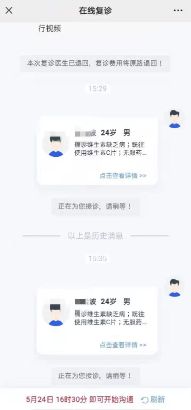 ④ 医生接诊后,进入复诊会话页,患者填写预问诊单,与医生进行病情交流
