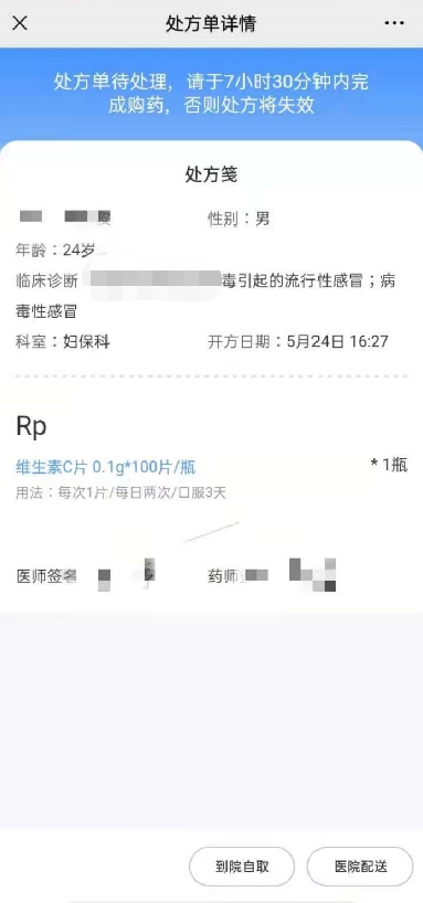 ⑤ 医生开出处方后,患者将接到购药提醒,可选择“到院自取”或者“医院配送”(若选择“医院配送”,需填写收货地址,默认顺丰快递)