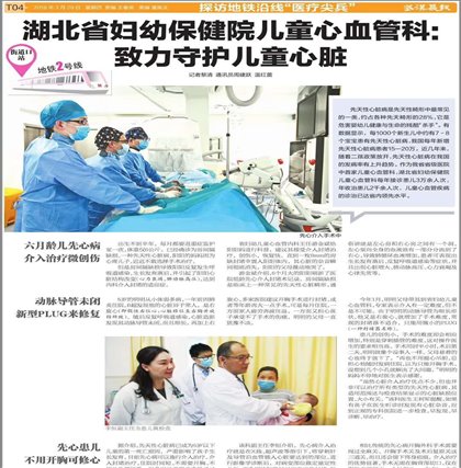 2018年4月湖北省妇幼保健院儿童心血管内科团队与武汉协和医院心脏大血管外科先心团队结成联盟,在湖北省妇幼保健院街道口院区开设先心病门诊,为先心患儿及怀有先天性心脏缺陷胎儿的孕产妇提供诊断、治疗、咨询等全方位的服务。