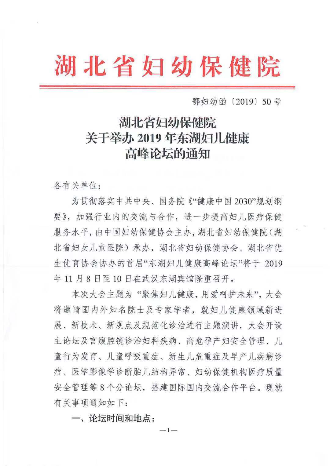 湖北省妇幼保健院关于举办2019年东湖妇儿健康高峰论坛的通知