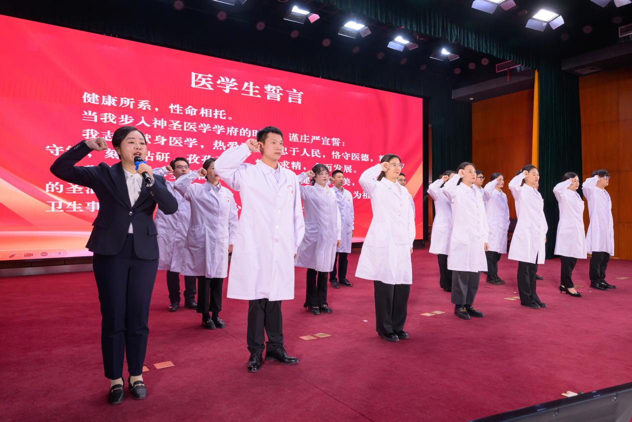 分享结束后,冯春带领我院18名青年医务工作者集体宣誓,重温《医学生誓言》,“健康所系,性命相托……我决心竭尽全力除人类之病痛,助健康之完美,维护医术的圣洁和荣誉……”铿锵有力的誓言回荡在会场各个角落,不仅是对职业使命的再次承诺,更是对守护人民健康的庄严宣誓。