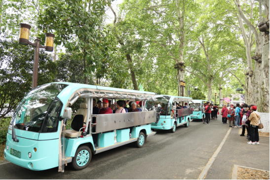 大家乘坐电瓶车游园,电瓶车平稳地行驶在园道上,湖光山色在眼前徐徐展开,微风轻轻吹过,让人倍感舒适。