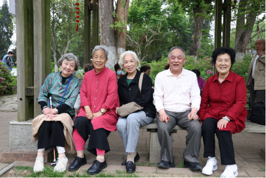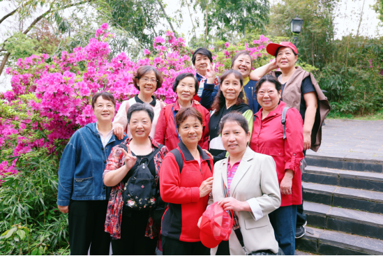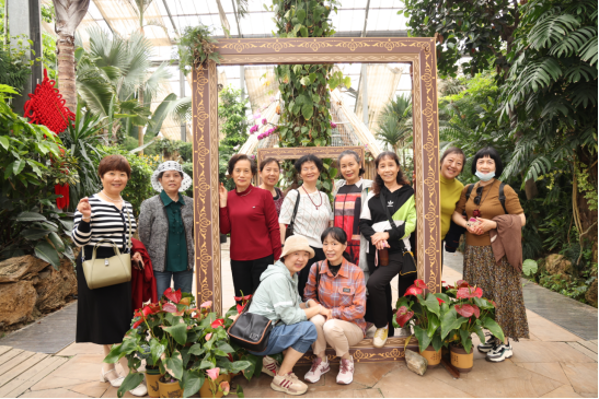 老同志们或驻足观赏,或拍照留念,或相互交流,沉浸在花的海洋中,脸上洋溢着幸福的笑容,仿佛回到了美好的年轻时时光。